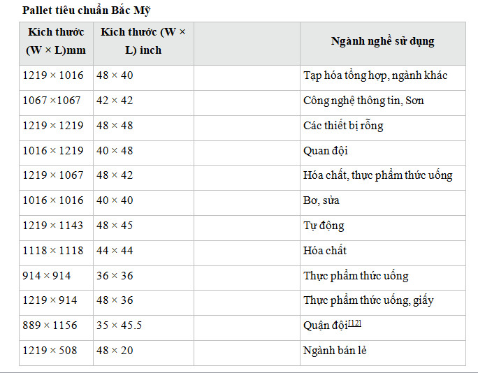 - Không có tiêu chuẩn công nhận về kích thước pallet đã tồn tại. Các công ty và tổ chức sử dụng hàng trăm kích thước pallet khác nhau trên toàn cầu. Trong khi không có một tiêu quy định nào để điều chỉnh pallet, chỉ có một vài kích thước pallet khác nhau được sử dụng rộng rãi sau: